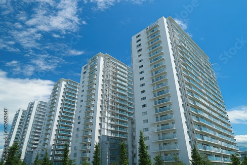 Modern high-rise residential apartment buildings in sunny cityscape with clear blue sky and contemporary architectural design