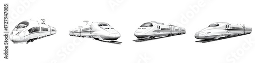 train, bullet train, railroad, railway, transport, transportation, travel, speed, modern, technology, commute, public transport, track, rail, isolated, white background, cut-out, collection, various, different, perspective, fast, express, electrical, infrastructure, engineering, design, minimalist, contemporary, vehicle, locomotive, commuter, urban, suburban, tour tourism, efficient, innovation, city