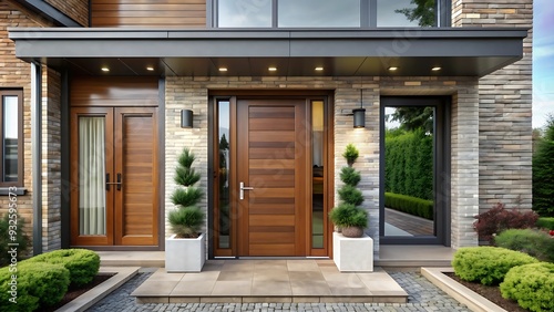Modern Home Entrance with Wooden Doors and Stone Walls.