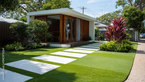 Modern Home Exterior with Stepping Stone Path and Lush Landscaping.