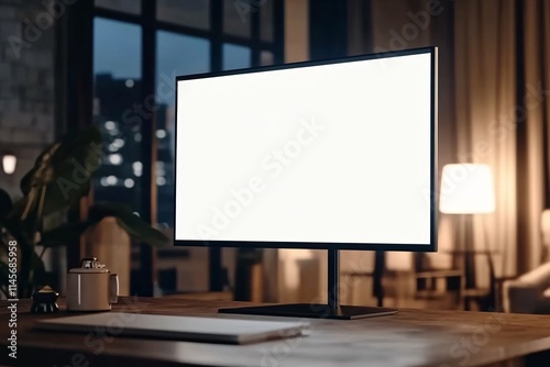 monitor, computer, screen, display, technology, workstation, office, home, night, light, desk, modern, design, empty, blank, interior, room, wooden, table, furniture