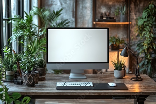 Modern Home Office Setup with Blank Computer Screen and Lush Greenery