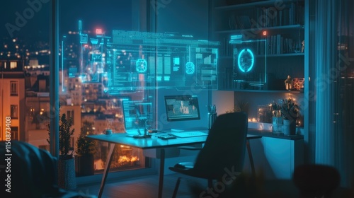 home, office, technology, workspace, urban, city, night, desk, screen, hologram, digital, light, furniture, cosy, productivity, innovation, computer, remote, design, electronic, decor, interior, panoramic, atmosphere, modern, creative, isolation, relaxation, inspiration, professional, connectivity, datum, analysis, programming, business, concentration, communication, lifestyle, visualisation, tool, network, environment, imagination, aesthetic, idea, vision