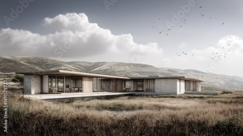 architecture, home, building, design, landscape, exterior, residence, property, real estate, house, residential, contemporary, villa, sky, cloud, nature, hill, grass, field, environment, nobody, architectural, construction, lifestyle, minimalist, modern architecture, luxury, tranquil, peaceful, serene, bird, flock, cloudscape, day, daylight, horizon, mountain, outskirts, perspective, plain, roof, sunlight
