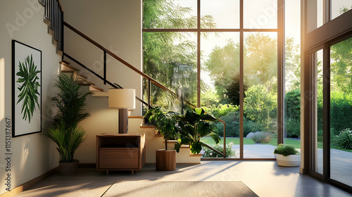 Modern home sunlit entryway with stairs, plants, and garden view; interior design, real estate.