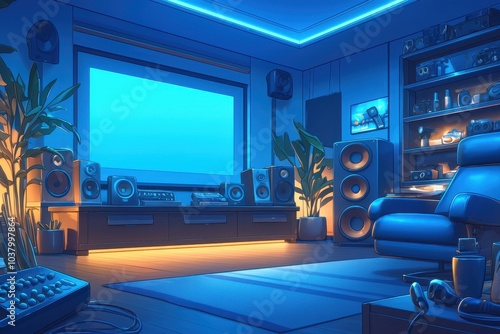 home, theatre, audio, visual, speaker, screen, display, technology, setup, modern, stylish, lighting, blue, ambient, futuristic, plant, interior, furniture, sound, equipment, console, shelf, high technology, entertainment, music, room, chic, digital, gamer, lounge, film, cinema, seating, design, electronic, luxury, comfort, workspace, device, organised, sleek, contemporary, acoustic