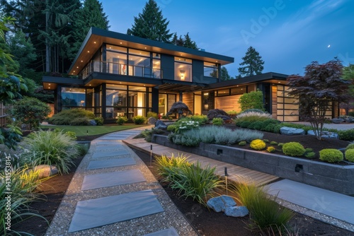 modern, house, exterior, night, illuminated, garden, pathway, landscaping, architecture, home, residential, light, design, real, estate, luxury, building, facades, tree, grass, evening, twilight, contemporary, property, front yard, entrance, stylish, neighbourhood, urban, clean, minimal, structure, housing, night time, quiet, peaceful, scenic, private, suburban, environment, detail, lighting, view, technology, lifestyle, copy space