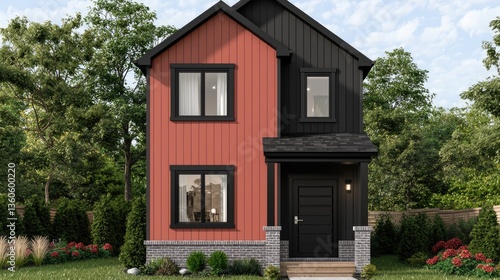 Modern house exterior with red and black siding and green trees background for real estate use