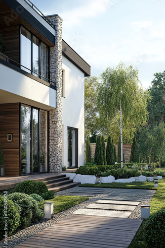 Modern house with a garden, front view, photo-realistic renderings, stone and wood elements, white walls, greenery around the yard, wooden floor, a concrete path leading to the entrance of the villa.