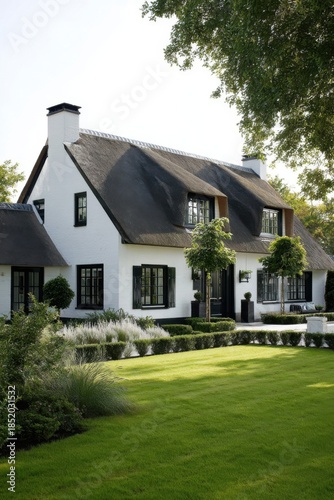 Modern house with a thatched roof situated in a well-maintained garden during daylight hours near green grass and shrubs