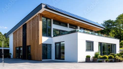 Modern House with Solar Panels and Wooden Details Surrounded by Lush Greenery and Clear Blue Sky