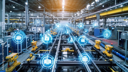 Modern industrial factory using automation and cloud computing for data exchange, improving efficiency and productivity