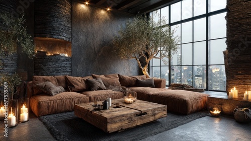 modern, industrial, loft, living, room, urban, city, view, roomy, cosy, warm, brown, dark, rustic, wooden, hot drink, table, sofa, couch, olive, tree, candle, lighting, geometric, contemporary, design, furnishing, relaxing, elegant, stylish, texture, stone, brick, concrete, floor, window, space, warmth, atmosphere, interior, city landscape, ambient, comfort, relaxation, natural, element, decor, minimalist