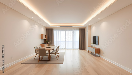 modern, interior, design, apartment, dining, room, table, chair, living, empty, beige, wall, panorama, isolated, white, highlight, contemporary, minimalist, sleek, chic, sophisticated, stylish, clean, roomy, open, natural, neutral, cosy, comfortable, functional, inviting, luxurious