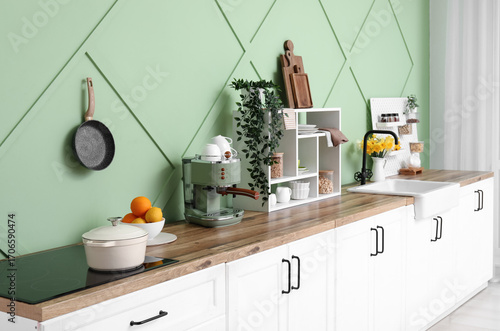 furniture, interior, kitchen, modern, stylish, apartment, background, beautiful, board, bowl, citrous, hot drink, colours, comfortable, contemporary, cook, cooking, counter, culinary, cutting, decor, design, detail, dish, domestic, electric, equipment, fashion, food, fruit, green, home, house, household, indoor, machine, object, pan, room, shelving, sink, stove, style, trendy, unit, utensil, wall, white
