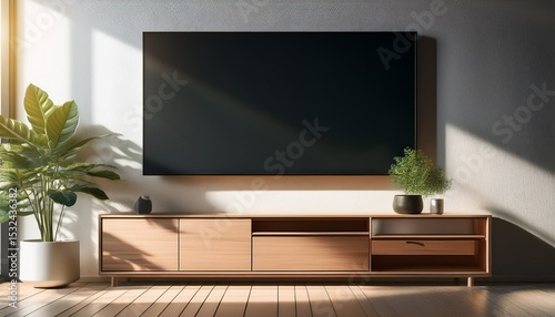 modern interior room with blank tv screen on wall above wooden cabinet and green potted plant in sunlight perfect for branding or design mockup