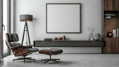 Modern interior with large roller blinds automatic solar and blackout shades wood decor panels on walls and electric sunscreen curtains for home With copyspace for text