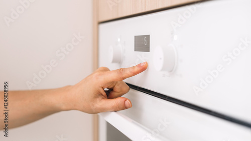 woman, start, baking, pastry, food, home, kitchen, appliance, interior, design, household, equipment, domestic, room, modern, apartment, residential, building, furniture, minimalist, style, white, oven, hand, adjustment, cooking, interaction, setting, person, homemaker, electric, cooker, bake, microwave, buttons, control, panel, knob, press, push, turn-on, power, select, mode, choose, program, time, temperature, closeup