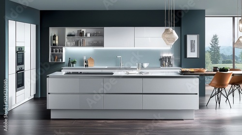 Modern kitchen design featuring sleek surfaces and natural light with an open layout in a contemporary home
