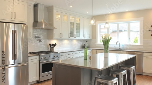 kitchen, design, appliance, modern, island, cooking, decor, lighting, cabinet, counter, utensil, sink, floor, open, space, home, interior, style, furniture, stainless, dining, glasses, storage, organisation, comfort, elegance, functionality, white, grey, wood, contemporary, roomy, bright, clean, minimalist, accessory, flower, atmosphere, warmth, layout, arrangement, aesthetic, renovation, ambience, family, gathering
