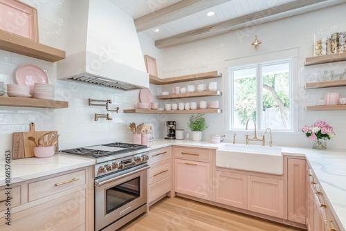 kitchen, modern, pink, accent, open, shelf, white, tile, cabinet, counter, stainless, steel, oven, stove, faucet, sink, window, wood, floor, light, ceiling, beam, decor, flower, greenery, plant, vase, dish, plate, bowl, cup, glassware, countertop, handle, drawer, farmhouse, home, design, interior, style