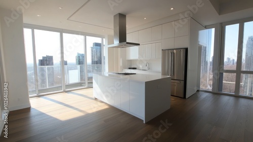 kitchen, modern, stainless steel, appliance, white, cabinet, island, city, skyline, view, window, contemporary, design, interior, home, apartment, condo, luxury, roomy, bright, light, wood, floor, elegant, clean, minimalist, stylish, open, concept, urban, living, cooking, dining, breakfast, bar, counter, faucet, sink, glasses, building, city landscape, highrise, penthouse, architecture, real estate, home decor, renovation, remodelling, new