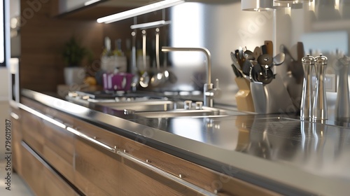 modern, kitchen, stainless steel, counter, sleek, contemporary, design, style, interior, home, house, cooking, culinary, appliance, decor, minimalist, clean, organised, functional, efficient, stove, oven, refrigerator, sink