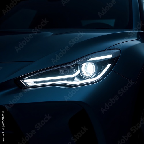 Modern LED Car Headlight Close-Up at Night: Crisp White Glow & Stunning Reflections on Glossy Body