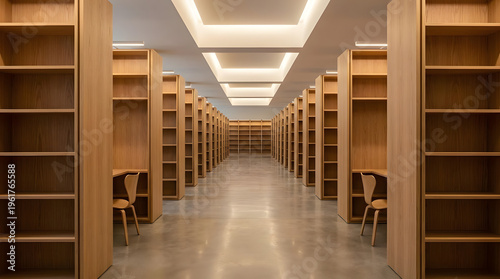 Modern Library Corridor Lined with Empty Wooden Bookshelves and Study Desks, Reflecting a Serene and Organized Space for Future Learning and Research