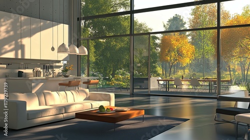 Modern Living Room: Autumnal View, Minimalist Design, Sunlit Serenity