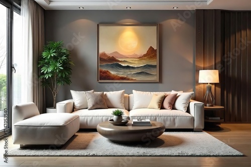 Modern Living Room Interior Cozy Sofa, Elegant Coffee Table, and Artistic Wall Decor in Soft Lighting, Perfect for Relaxation