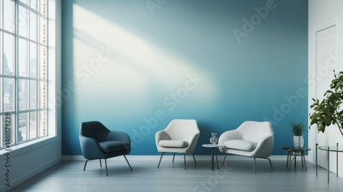 wall, high, end, finish, sophisticated, space, room, interior, design, modern, living, colours, gradient, blue, white, chair, furniture, light, window, contemporary, space, style, empty, modernism, decor, minimalist, simple, home, cosy, calm, relaxing, sofa, table, plant, lighting, window, sunlight, neutral, soft