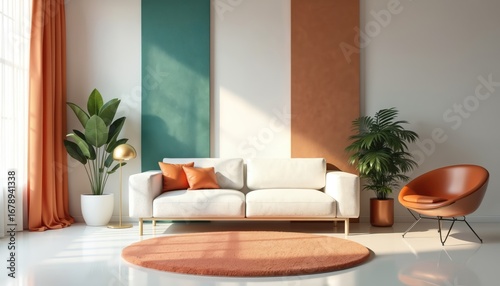 Modern living room interior features white sofa with orange pillows, accented by round coral rug. Sleek orange armchair, potted green plants complement space, set against wall with vertical color
