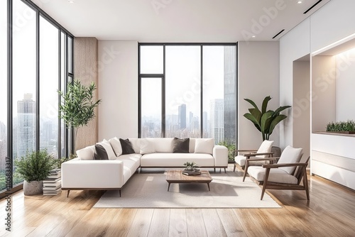 Modern Living Room Interior with White Sofa, Armchairs, Wooden Floor, Coffee Table, Minimalist Design, 3D Rendering Mockup for Apartment or Hotel Lounge