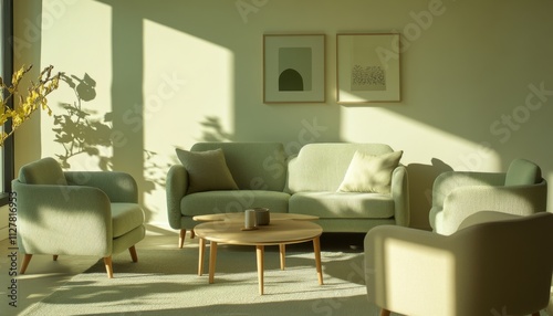 sofa, armchair, living room, interior, design, furniture, modern, contemporary, home, decor, green, sage, sunlight, light, shadow, minimalist, calm, peaceful, relaxing, comfortable, cosy, stylish, elegant, room, apartment, house, interior design, home decor, pastel, texture