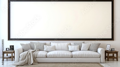 room, living, modern, sofa, couch, pillow, cushion, blanket, frame, picture, wall, art, design, interior, home, decor, furniture, style, minimalist, apartment, house, space, contemporary, comfort, relaxing, serene, calm, cosy, elegance, luxury, white, beige, wood, neutral, texture, large, blank, empty, template, display, background, image