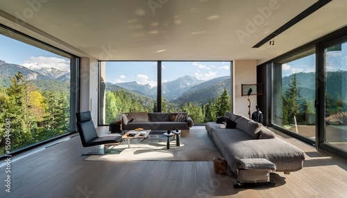 modern living room with large windows overlooking trees and mountains