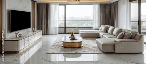 interior, modern, living room, couch, sofa, sectional, furniture, design, style, luxury, contemporary, home, decor, apartment, house, window, view, city, city landscape, floor, marble, gold, white, grey, light, roomy, elegant, clean, minimalism, comfortable, pillow, cushion, table, hot drink, rug, glasses, large