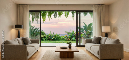 Modern living room with two gray sofas, wooden coffee table, and large glass doors opening to a tropical garden view at sunset.