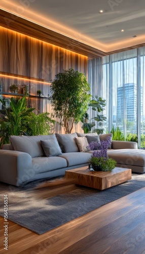 modern, living, room, wooden, sofa, plant, greenery, light, cosy, elegant, roomy, natural, luxury, interior, design, ledge, comfortable, natural light, city view, large, contemporary