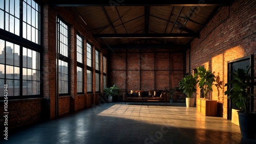 Modern Loft Interior with Brick Wall and Large Window - Night Photography of Spacious Room Featuring Plant Decor and Industrial Style Elements for Contemporary Home Design Inspiration
