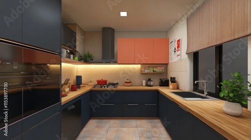 kitchen, modern, cabinet, blue, dark, orange, wood, countertop, appliance, integrated, design, interior, home, cooking, space, style, contemporary, room, furniture, decor, apartment, house, utensil, sink, faucet, window, light, lighting, floor, tile, wall, shelf, storage, clean, neat, minimalist, luxury, elegant, comfortable, bright, warm