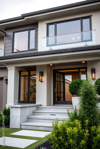 house, home, exterior, architecture, modern, design, luxury, residential, building, contemporary, property, entrance, door, window, balcony, facades, step, landscaping, style, pathway