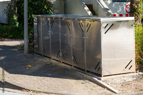 Modern metal storage units on a city street in bright daylight