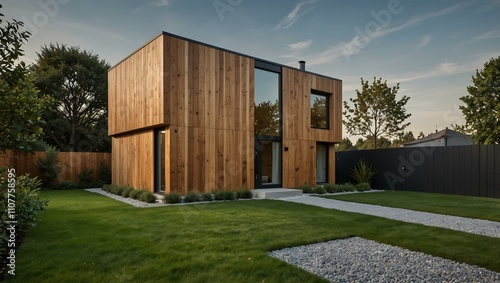 Modern minimalist cube house with wooden cladding and landscaped front yard.