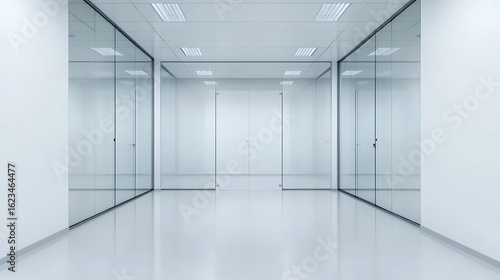 Modern, minimalist hallway with glass-walled rooms and white walls and floor. Clean, bright, and professional design. Ideal for office or medical settings.