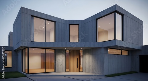 Modern minimalist house exterior with large windows and concrete facade at dusk