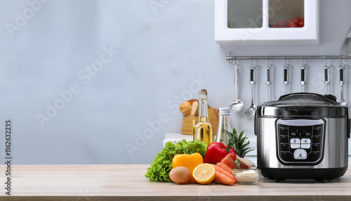 Modern multi cooker and products on table in kitchen. Space for text