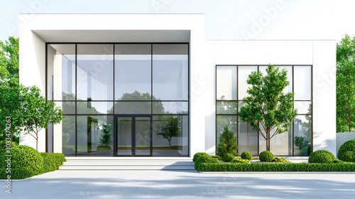 Modern office building with large glass windows and minimalist design, surrounded by greenery and neatly trimmed bushes, creating serene and professional atmosphere