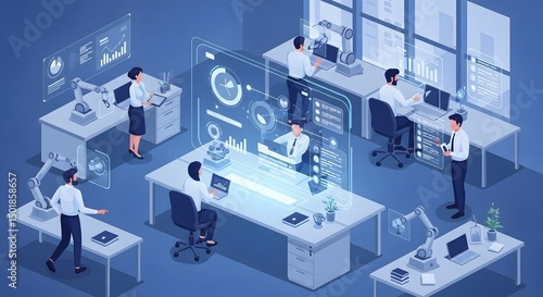 Modern Office Environment with Professionals Engaged in Various Tasks and Holographic Data Displays